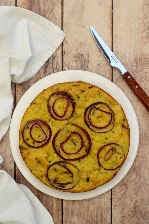 - Verser dans un moule à charnière (à défaut moule à manqué ou silicone), disposer les rondelles d'oignon rouge réservées puis enfourner.